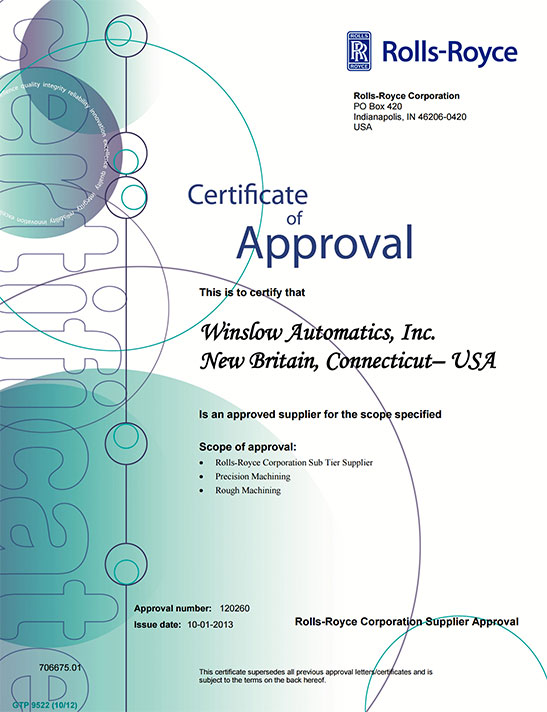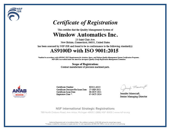 Winslow Automatics is proud to be certified to the AS9100D and ISO 9001:2015 standard of quality, audited in accordance with AS9104/1:2012 Below is a copy of our certificates:
